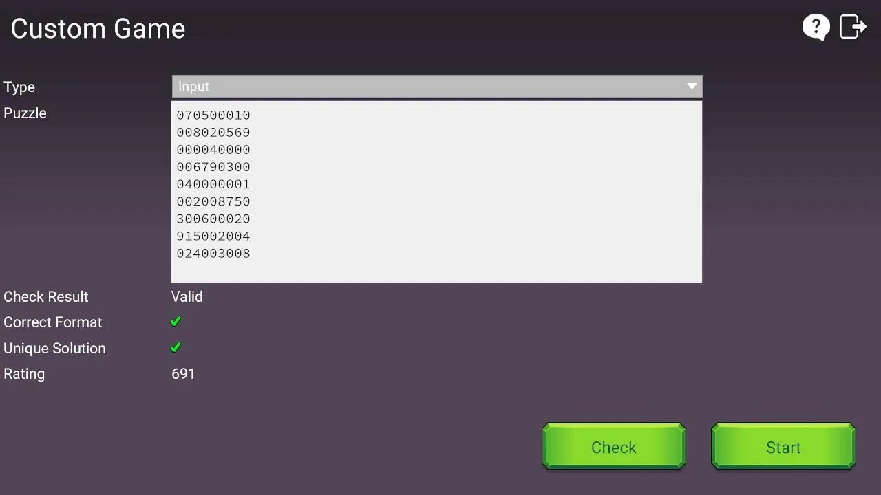 Type in the puzzle content, click Check to find out if the puzzle is valid (i.e. if there is one and only one solution) and what its difficulty is, and then you can start solving the puzzle! It’s that simple!